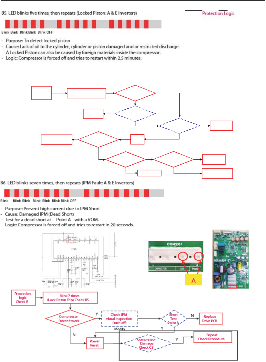 • Page 30Compressor 12-1 Check B B1. LED blinks once, then repeats (FCT0 Fault: A-Inverter) Blink OFF Blink OFF - Purpose: Detecting motor current and voltage error - Check voltage at point A (Motor Voltage), point B (Motor Current) and Point C (Capacitor Voltage) when compressor is off. - Spec: Points A, B,