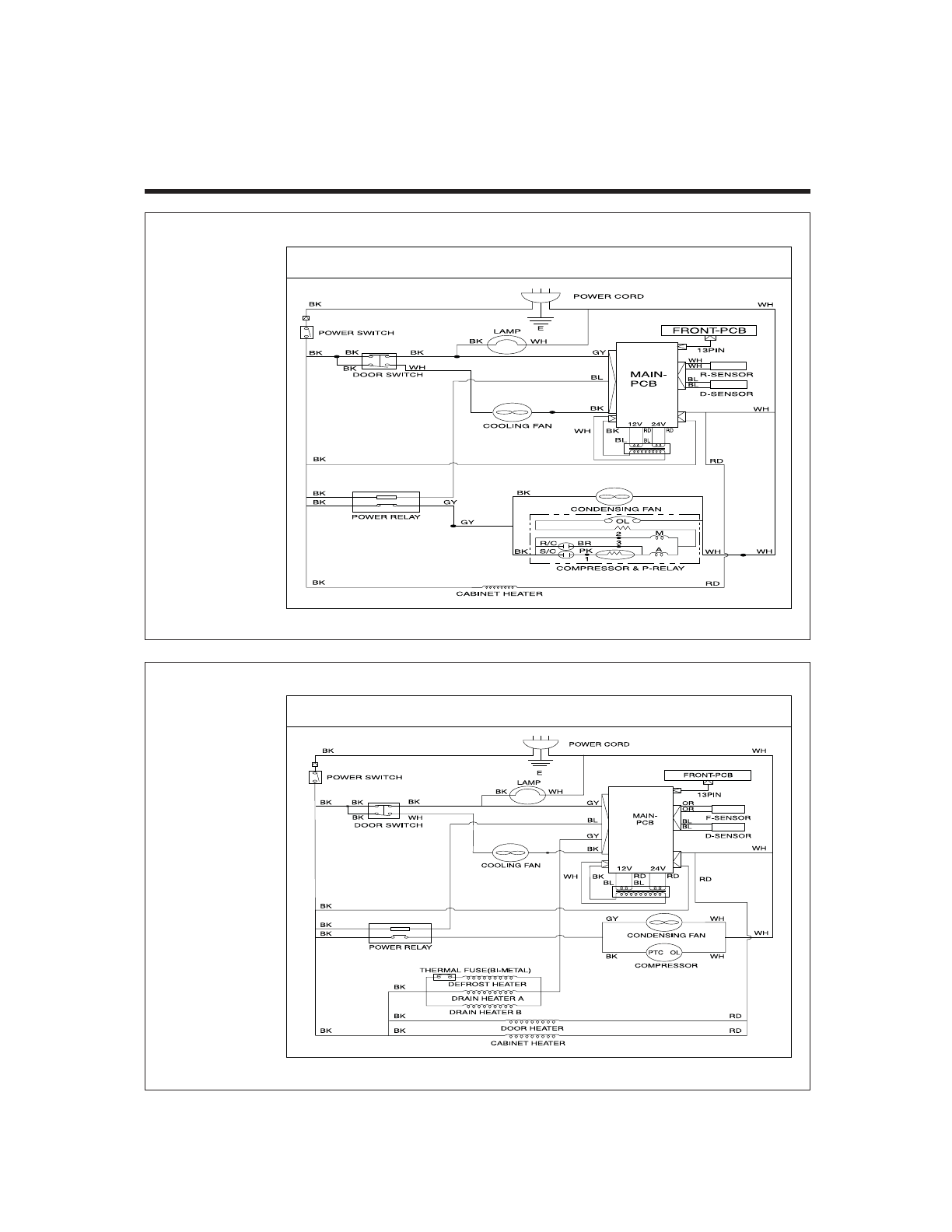 • Page 43REPLACEMENT OF MAIN COMPONENTS I . Assemble the pins in original positions. J. Connect the connectors of the evaporator defrost heater to them of the thermal fuse * NOTE Why is always 115 voltage detected between connectors of the evaporator defrost heater in the main harness? The SNUBBER(located Ma