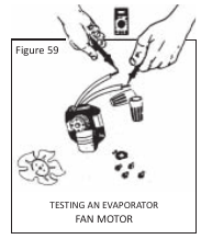 If the unit fails to cool and you notice an accumulation of ice on the evaporator panel, and you are suspicious of a fan motor that does not operate, or operates at a lower speed, in general, everything said about checking a condenser fan motor holds true for an evaporator fan motor. (See fig. 59)