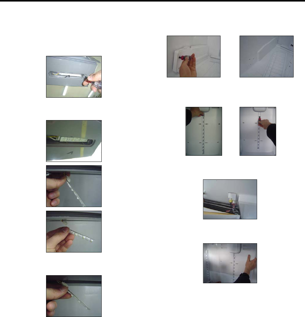 • Page 10gerator power cord from electric outlet. 1. Remove 2 screws and guide rail. frigerator door to need diassembly. wdriver into service hole, remove the cover LED LAMP. 2. Remove the upper and lower Caps by using a flat screwdriver and remove 2 screws as shown figure. LED assembly from connector. 3. Di