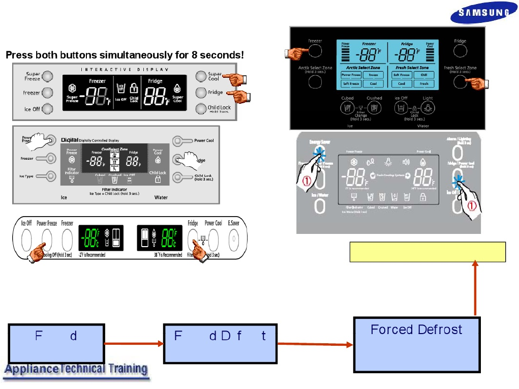 • Page 8Refrigeration Troubleshooting • Forced Defrost Operation • Standard compressor models can activate the Fridge defrost only, or both the Fridge and Freezer defrost. • Inverter compressor models activate all heaters at once. controls the heater operation. When defrost is activated the main PCB will tu