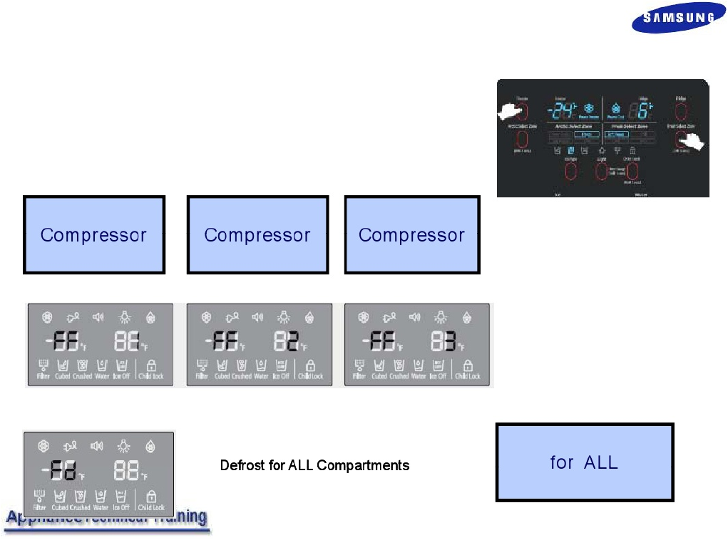 • Page 15Refrigeration Troubleshooting • The Diagnostic Mode is the most valuable troubleshooting tool you have for troubleshooting a refrigerator. When you are at e p r ou c s s e rs e s y o u so u o. • When a Samsung refrigerator is powered up if performs a Self Diagnosis, if an open or shorted sensor is d