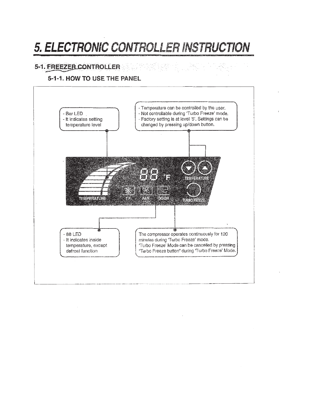 • Page 30REPLACEMENT OF MAIN COMPONENTS F. Pull out the harness located back of top grille panel. You can separate top grille panel. You can replace power switch(rocker switch), door switches(lamp switch) and control board housing. G. To re-assemble, do reversed in order.