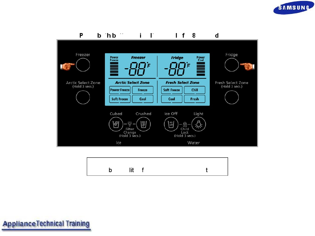 • Page 15Refrigeration Troubleshooting • The Diagnostic Mode is the most valuable troubleshooting tool you have for troubleshooting a refrigerator. When you are at e p r ou c s s e rs e s y o u so u o. • When a Samsung refrigerator is powered up if performs a Self Diagnosis, if an open or shorted sensor is d