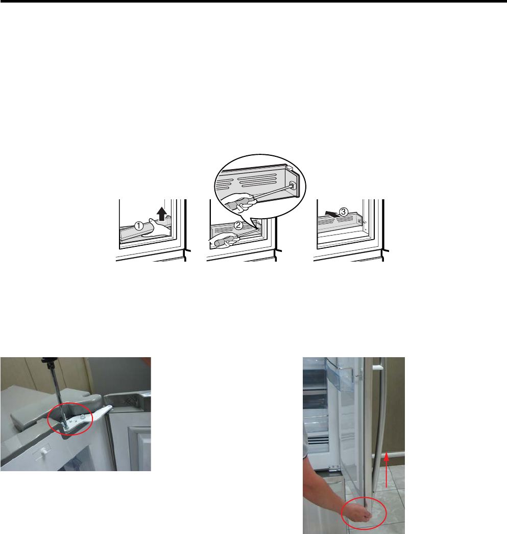 • Page 9rator, or disconnect power at the circuit 1. Unplug refrigerator power cord from electric outlet. 2. Put flat screwdriver into sevice hole and remove cover of move top shelf or shelves. refrigerator light. ator Compartment Lamp crews. nds with your both hands and pull it o remove it. 3. Remove the L