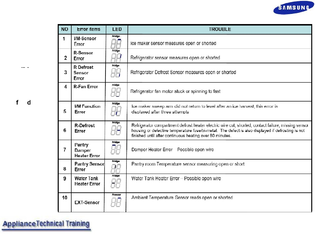 • Page 21Error Code Display Pt 2 - NO Error items LED TROUBLE I/M FUNCTION Ice maker did not return to level after an ice harvest, this is Codes shown are for 5 ERROR displayed after three attempts example, of codes for the Refrigerator Compart ment defrosti ng heater- electric wire cut, R-DEFROSTING short-c