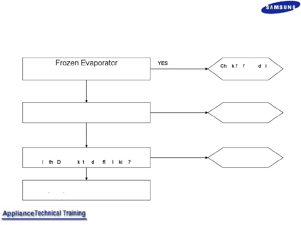 • Page 29Defrosting Troubleshooting Check for any fault codes in the manual Diagnostic Mode ec or rozen ra n Ask the Consumer if there has been water or ice build up and/or open drain heater on the bottom of the Fridge compartment or the floor. NO YES Frozen Evaporator Replace heating element Is the Defrost
