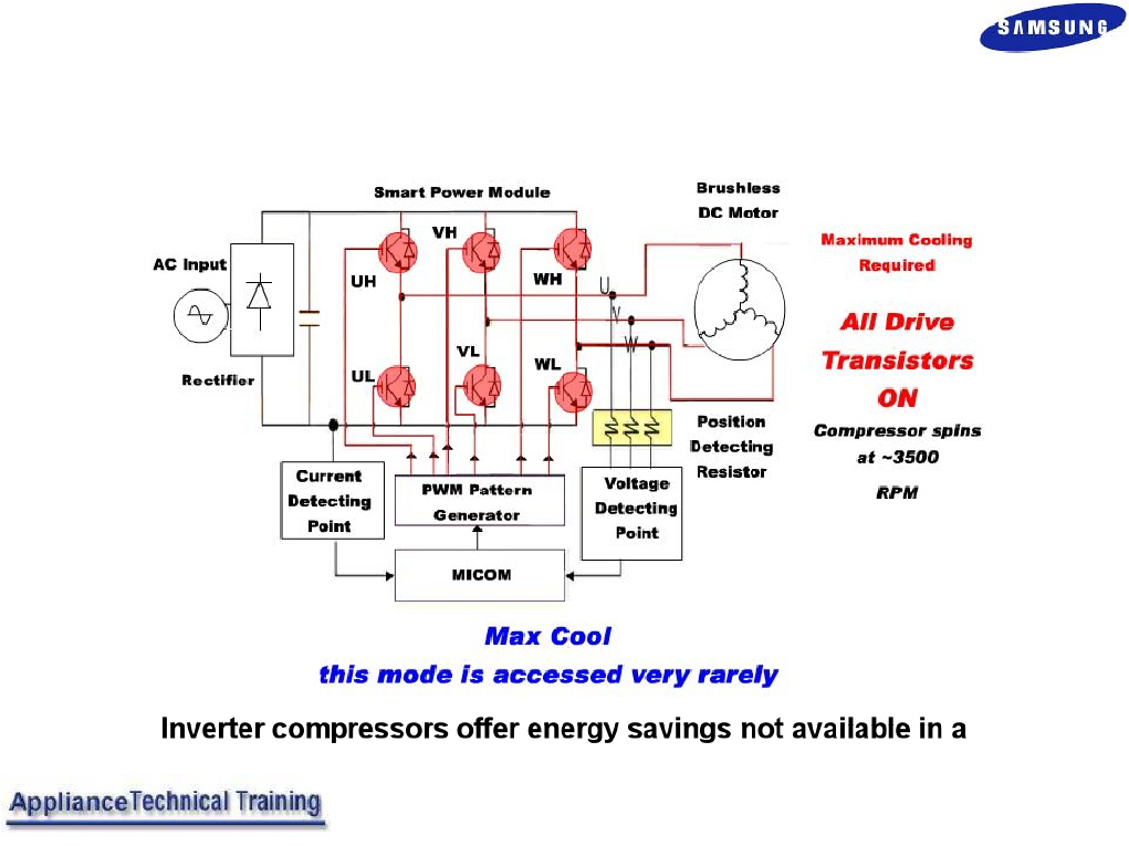 • Page 41Diagnosing the Inverter Compressor The LED on the Inverter drive PCB will be off when the compressor is off and on whenever the compressor is running. If a defect should occur in the compressor the number of times the LED blinks will indicate where the fault might be. 57