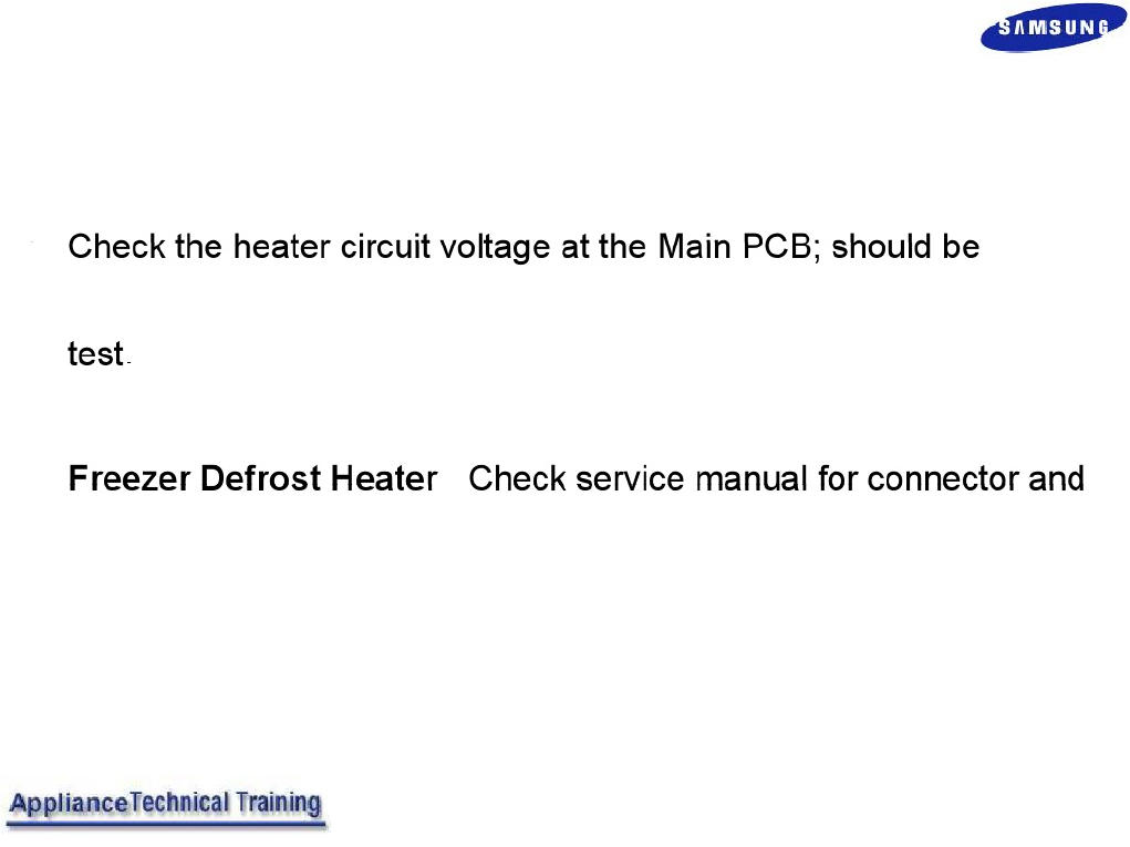 • Page 32Defrosting Troubleshooting Part 2 Enter the Forced Mode per instructions • Check heater circuit amperage at the Main PCB or A/C line; ~. ~. 3.4 NOTE:amps total. If compartment is warm, you only have about 90 seconds . • Freezer - Check service manual for connector and wire color code for the model b