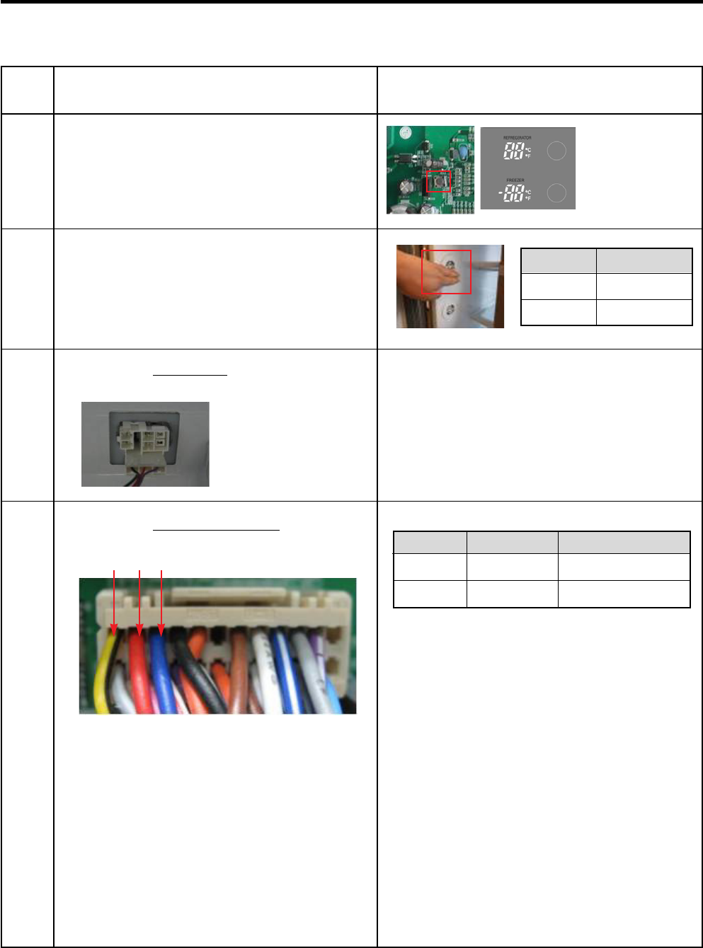• Page 46Checking flow Result & SVC Action Check the Refrigerator door switch. If feel sticky, Change the door s/w. Check the door Switch resistance. Status Result SVC Action 0Ω Go to the 3 Normal Other Change door Switch Push Infinity Go to the 3 S/W Other Change door Switch Check the Red/yellow to Pink. St