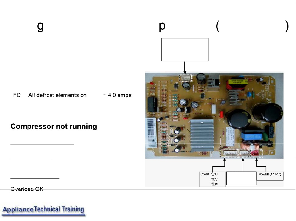 • Page 30Testing Defrost Circuits ccess e ma n or vo age res s ance es ng – With the compressor running test the sensors – Enter Forced Mode Defrost – Measure the heater voltage – Remove the power and heater connector and check the • Defrost Sensor – The sensor shuts off heater At 50℉ in Freezer, 63℉ in Frid
