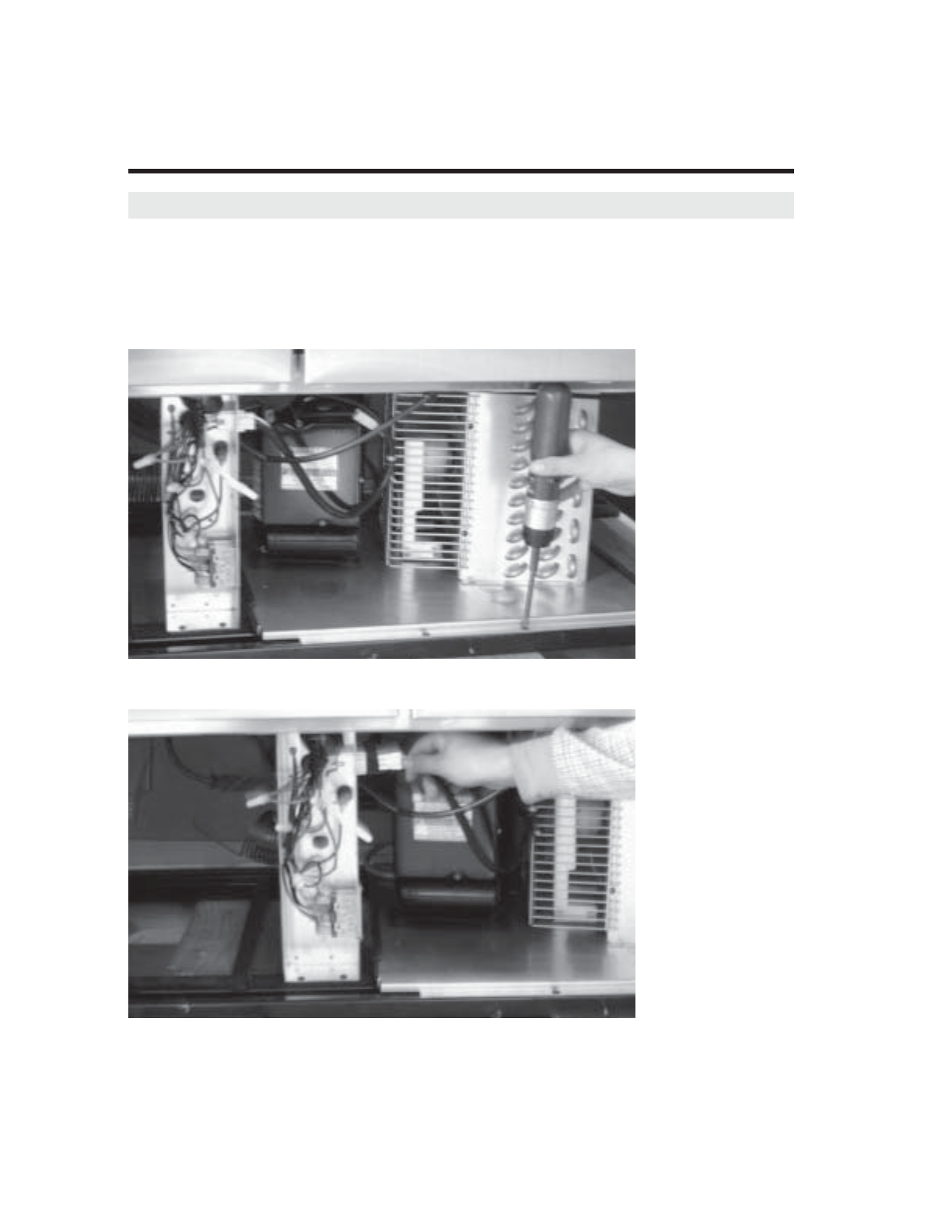 • Page 47REPLACEMENT OF MAIN COMPONENTS E. Below picture shows the inlet of the F. Uncap connectors of the cabinet frame cabinet frame heater toward the heater. electrical box. G. Pull out the heater wire from the inlet. H. Insert the new cabinet frame heater wire to the inlet, after surrounding it along the