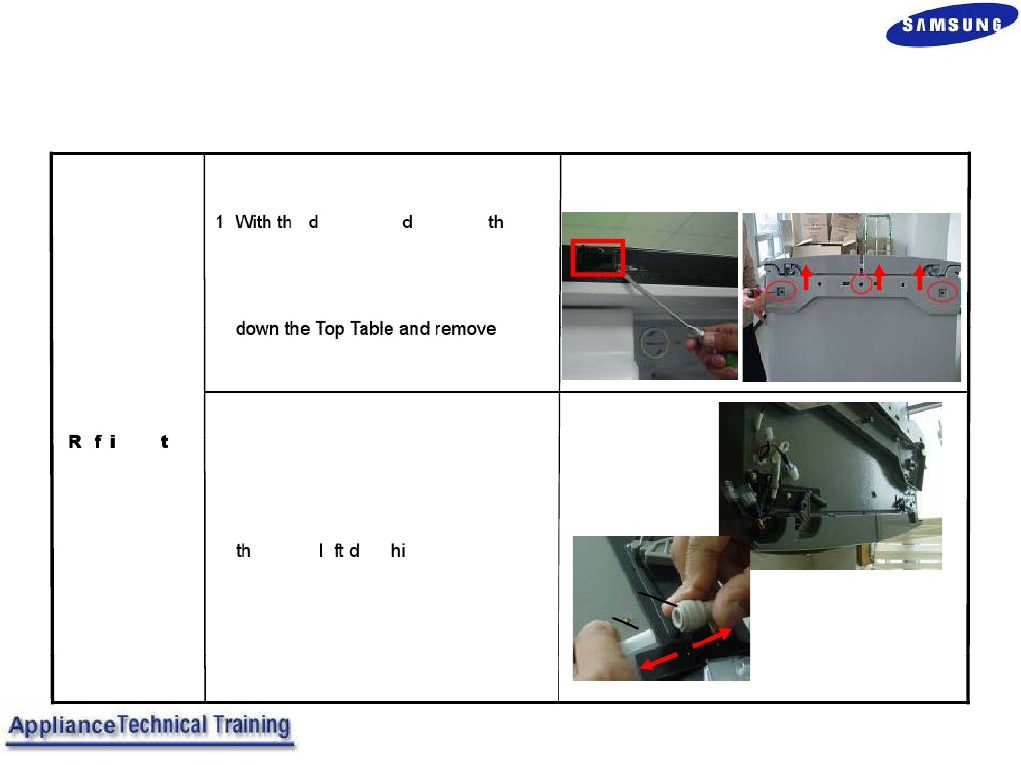 • Page 60Door Removal – French Door Model . e oor opene , remove e Top Table cap① with a Flat head screwdriver, and close the door. ② ① Remove the 3 screws holding the Top Table ②. e r gera or ④ Door 2. Disconnect the electrical connector ③ above the upper right door hinge and ③ the 3 electrical connectors ④