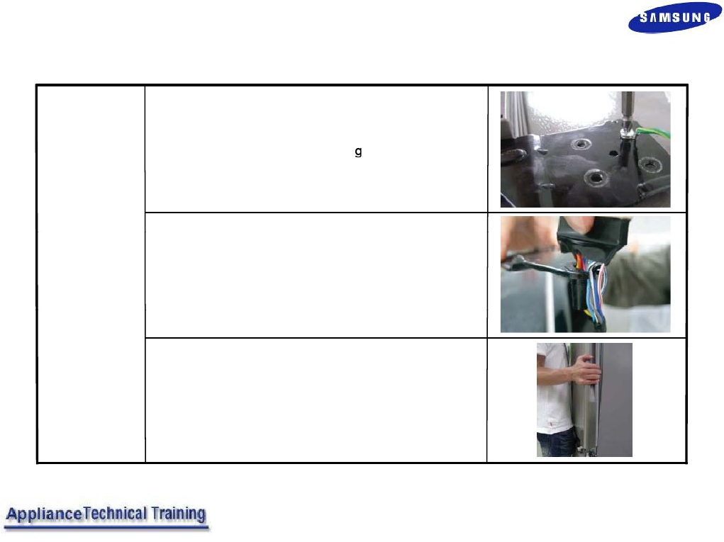 • Page 65Door Removal – Bottom Mount Model 4. Remove the screw that hold the round wire. 5. Separate Hinge from electric wire and ground wire as Refrigerator shown below. Door 6. Disassemble the fridge door by lifting it upward. Be careful not to drop and scratch the fridge door. 81