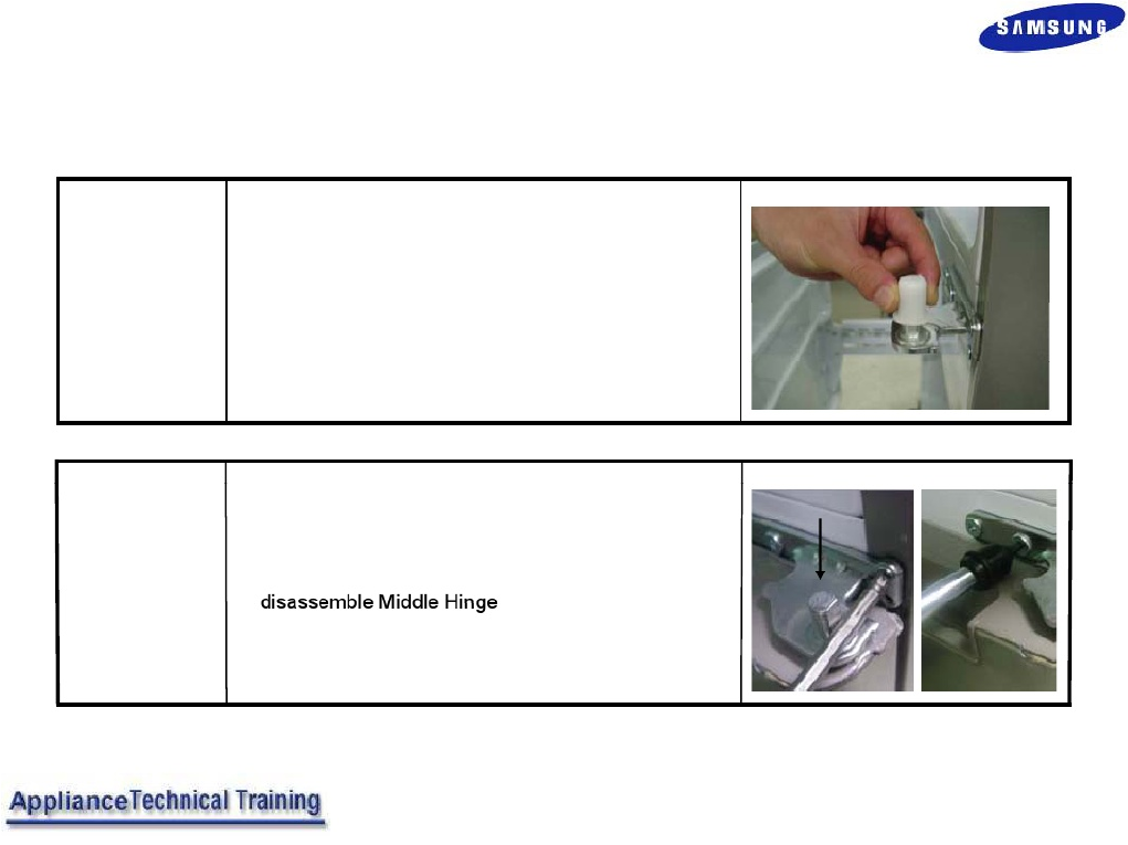• Page 67Door Removal – Bottom Mount Model 2. Remove/Disassemble the Middle Hinge connected to the Freezer. 3. Disassemble the Freezer door by lifting it upward. Be Freezer Door careful not to drop and scratch the Freezer door 4. Disassemble the Cap on the Low Hinge. 83
