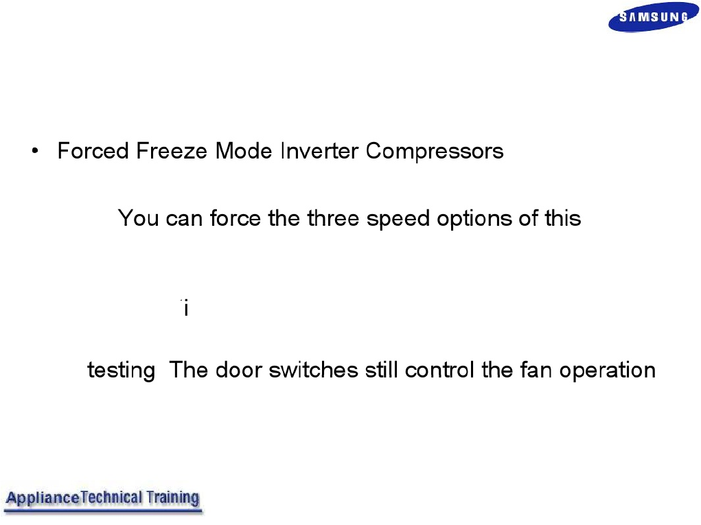 • Page 12RFG29* Series Inverter Compressor Forced Mode For Test Mode Press both buttons simultaneously for ~15 seconds! Press Freezer button One time at the Test Mode to Force each Compressor test Forced Forced Forced Wait 5 seconds between ompressor ompressor ompressor button presses High Mid Low 3600 RPM 2